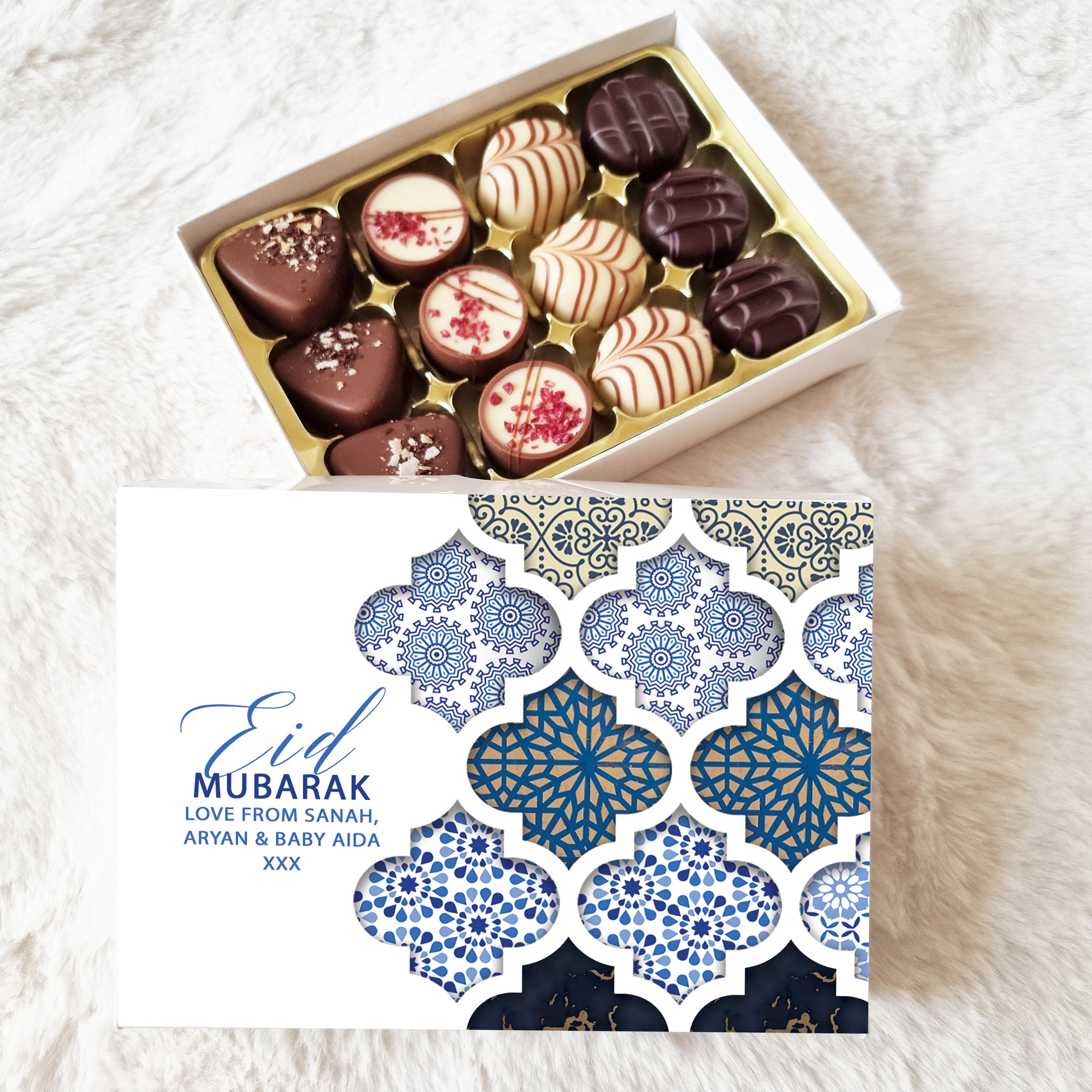 xSend loved ones this Eid a personalised chocolate box with 6 or 12 indulgent chocolates and message of choice on the lid. With 6 filling options of each handmade belgian chocolates these will definitly bring a smile this Eid.