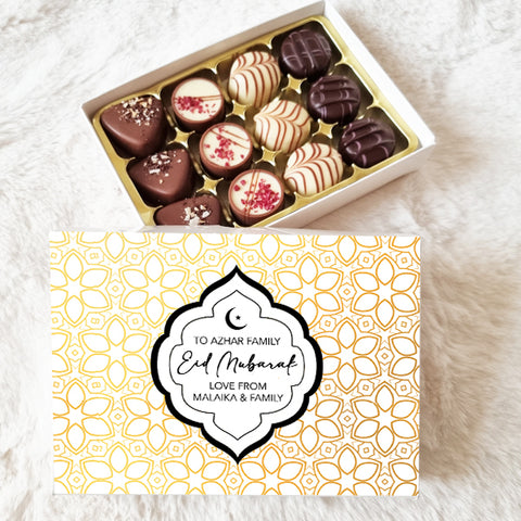 Send loved ones this Eid a personalised chocolate box with 6 or 12 indulgent chocolates and message of choice on the lid. With 6 filling options of each handmade belgian chocolates these will definitly bring a smile this Eid. 6 Box size: 11.5 x 8.5 x 3.5cm 12 Box size: 16 x 11.5 x 3.5cmSuitable for vegetarians and alcohol free. To Personalise: Max 60 characters - Eid Mubarak will be on design as standard. If you are purchasing multiple items with different messages, please add message of choice and add the item to cart before proceeding with the next message...